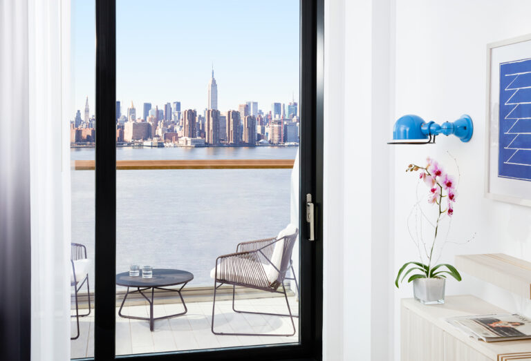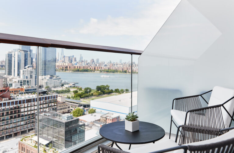 Modern balcony with two chairs, small table, and skyline view of Manhattan across the river.