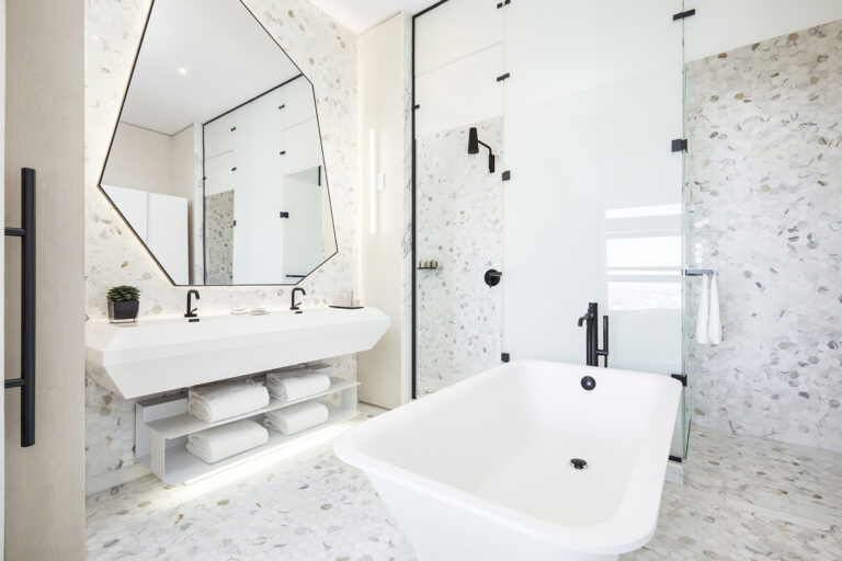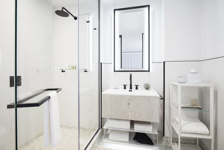 Sleek bathroom with walk-in shower, illuminated mirror, and black fixtures.