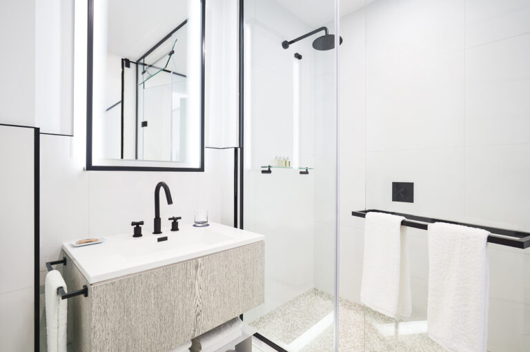 Modern bathroom with glass shower, black fixtures, and vanity.