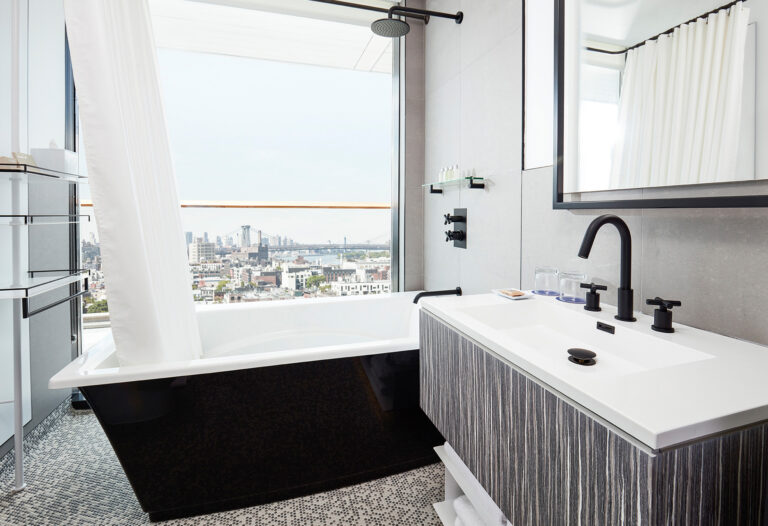 Modern bathroom with black fixtures, deep soaking tub, and city view through large window.