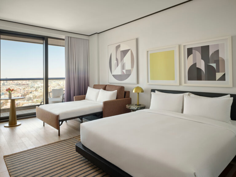 Hotel room with king bed and pull-out sofa bed, large windows overlooking cityscape.