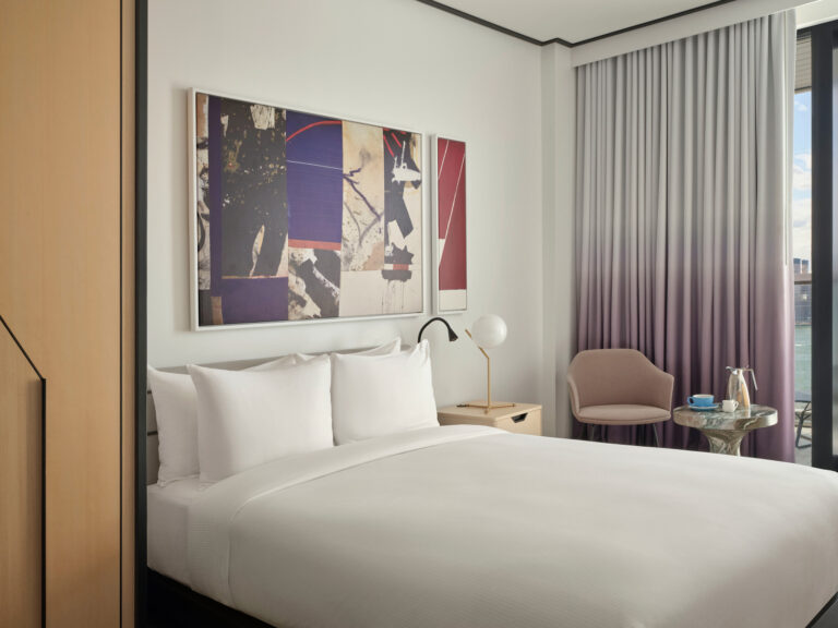 Contemporary bedroom with white linens, floor-to-ceiling window, wall-mounted TV, and city view.