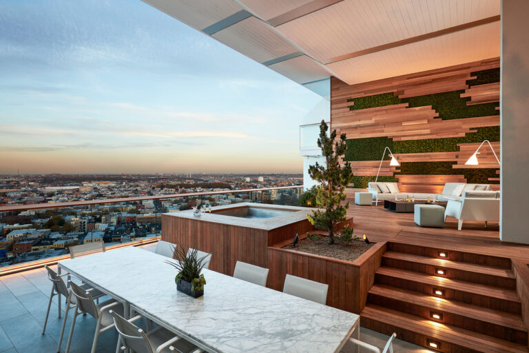 Rooftop terrace with marble dining table, hot tub, and city view.
