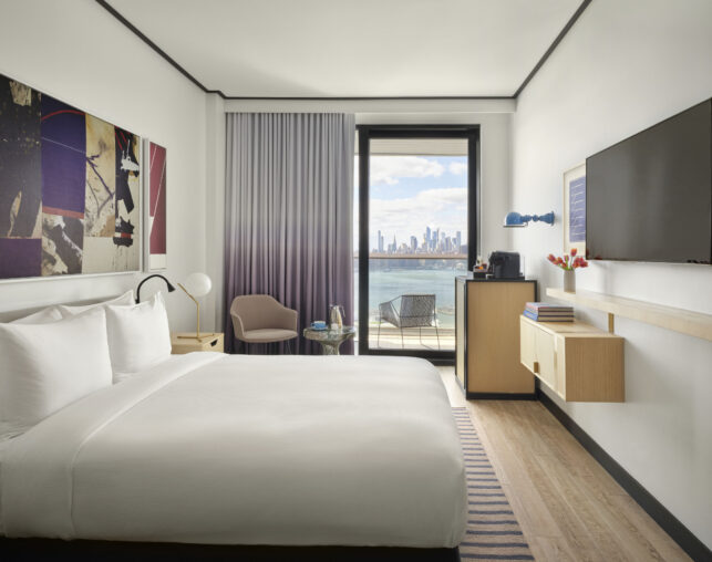 All king rooms at The William Vale include a spacious private balcony overlooking Williamsburg, a comfortable sitting area, as well as glass-enclosed rainfall showers, La Labo toiletries, bathrobes, and Lavazza coffee makers.